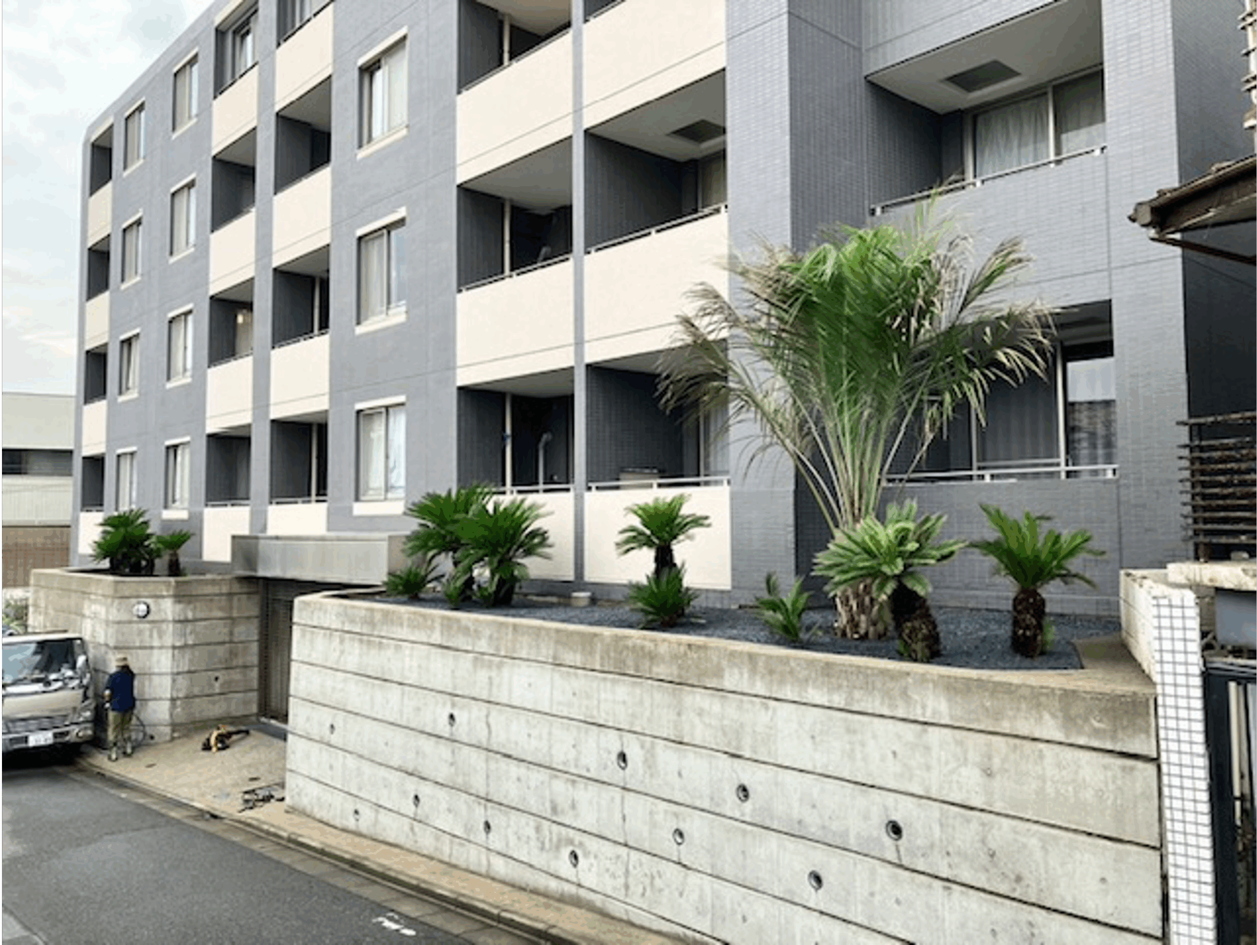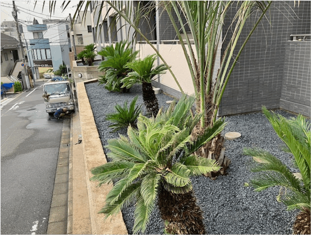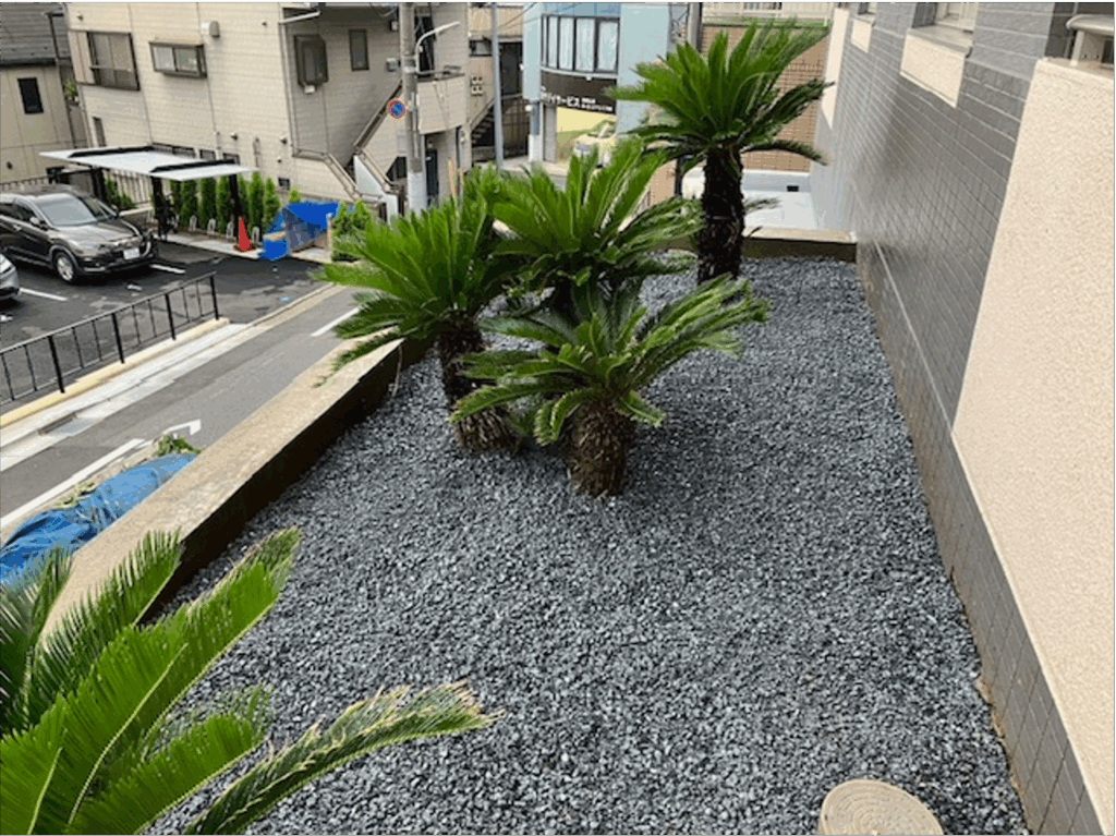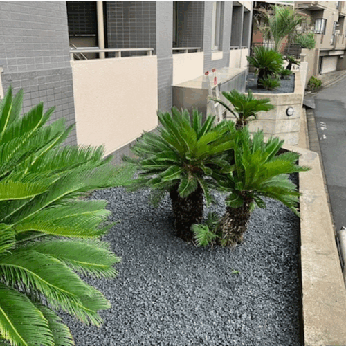 大田区 集合住宅 施工後 施工後 施工後 施工後 施工後 存在感のある大きなシンボルツリーは、地域のランドマーク! 都内の高級住宅地の高台に建つ低層マンション。エントランス前の花壇には傷んだツツジ、ツゲなどの低木類、道路側の2階に設置された広い花壇にはソテツとツゲ、ツツジなどの中低木が雑然と植えてあるだけといった、おしゃれで重厚な外観に対して、メリハリに乏しい植栽構成でした。そこでエントランス前の花壇を葉張りたっぷりのオリーブとコニファー、足回りはコンフェッティとシンプルな洋風にチエンジ。2階の花壇はソテツ以外は全部撤去したのち、シンボルツリーとして大人気のココスヤシを植栽しました。床面には防草シートを張ってから上にシックな砂利をかぶせたので防草対策はバッチリです。今後は表に「ヤシ」がドーンと鎮座するマンションとして、地元で認識されるに違いありません。 BEFOR AFTER 施工例名 大田区 集合住宅 工事内容 リ・ガーデン工事 場所 大田区 集合住宅 コンセプト 外観に釣り合う植栽構成を探求! お問い合わせ